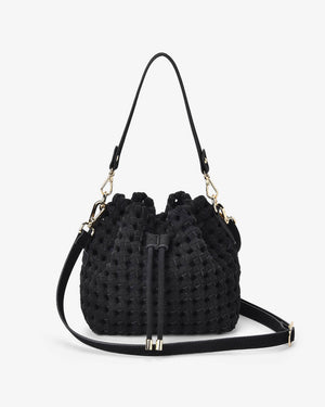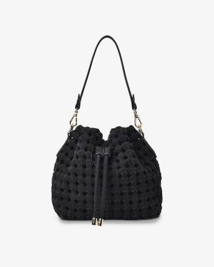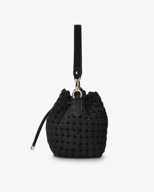 The Box Weave Bucket is a new season bucket bag that blends artisanal texture with everyday versatility. Crafted from soft micro suede that includes recycled materials, this statement crossbody bag features a hand-crafted box weave exterior for a rich, dimensional finish. Designed with both a short shoulder strap and a removable adjustable crossbody strap, it moves effortlessly from day to evening. Relaxed yet refined, the Box Weave Bucket is a standout addition to the Elms+King range.