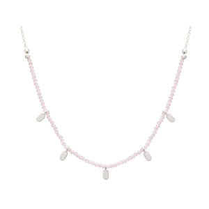 The Celestial Rose, Rose Quartz Choker in Sterling Silver features hand beaded, natural Rose Quartz stones along with octagonal metal tags with a soft satin finish. This necklace can be worn as a choker style or as a medium length necklace, making it perfect for various layering styles. This jewellery item comes with its own dedicated signature pink MURKANI box.