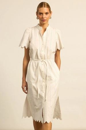 Crafted in cotton poplin broderie, the Portside Dress from Zoe Kratzmann is shaped with precision. Linear broderie creates a modern and flattering aesthetic. A scalloped hem and cuffs add refinement and versatility.