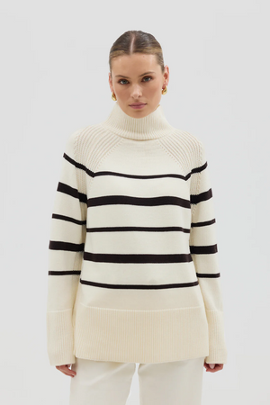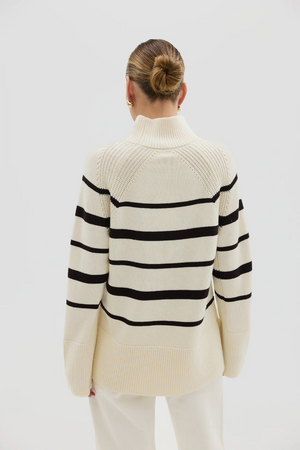 The High Neck Stripe Sweater is a timeless knit elevated by clean lines and a bold stripe design. Knitted from luxuriously soft Australian Merino wool, this cosy yet breathable piece features a high ribbed neckline, relaxed silhouette, and wide ribbed cuffs and hem for modern structure.