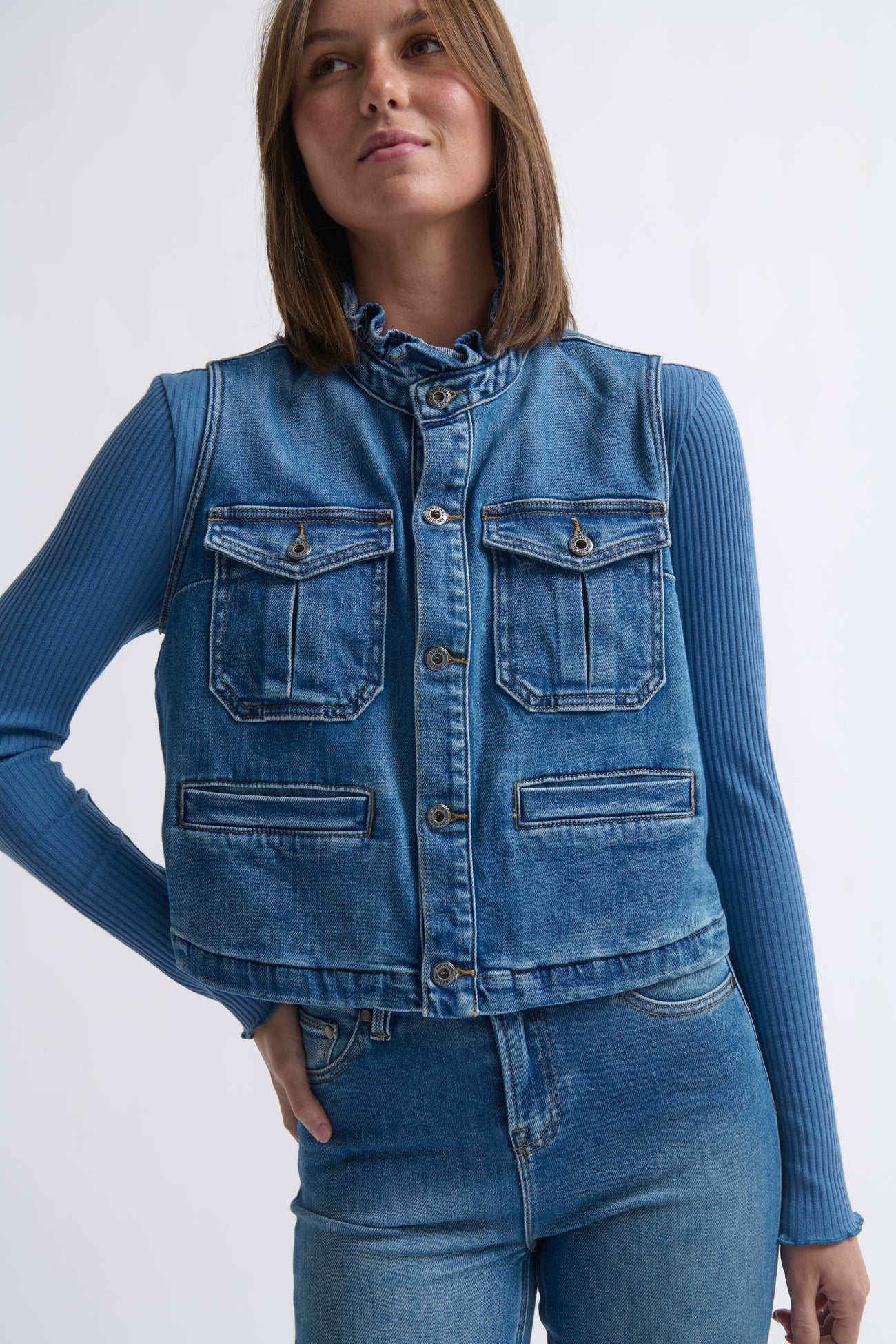 Proof that the right separate can be the finishing touch your outfit’s been waiting for, the Erica Vest blends ease with elevated detail. A softly ruffled collar, inverted pleat patch pocket with flap, and refined welt pockets bring texture and interest - all crafted in our signature soft denim. Style it with your favourite jeans and a denim shirt for a confident triple-denim moment, or layer it over a crisp white tee for a clean, classic silhouette that feels effortlessly put together.