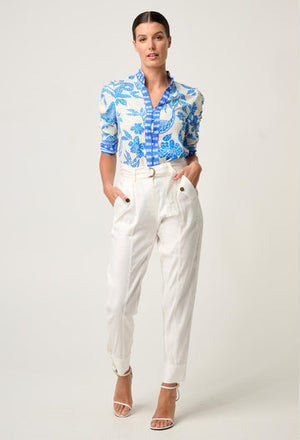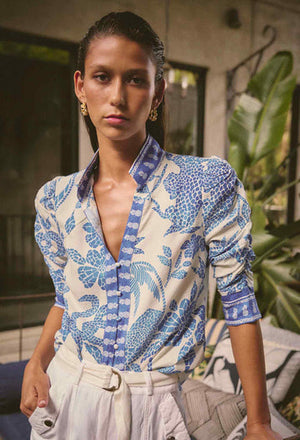 The Calantha Shirt in the stunning Azure Mosaic print by Once Was is the perfect shirt to pair back with denim this Spring to create a chic outfit.