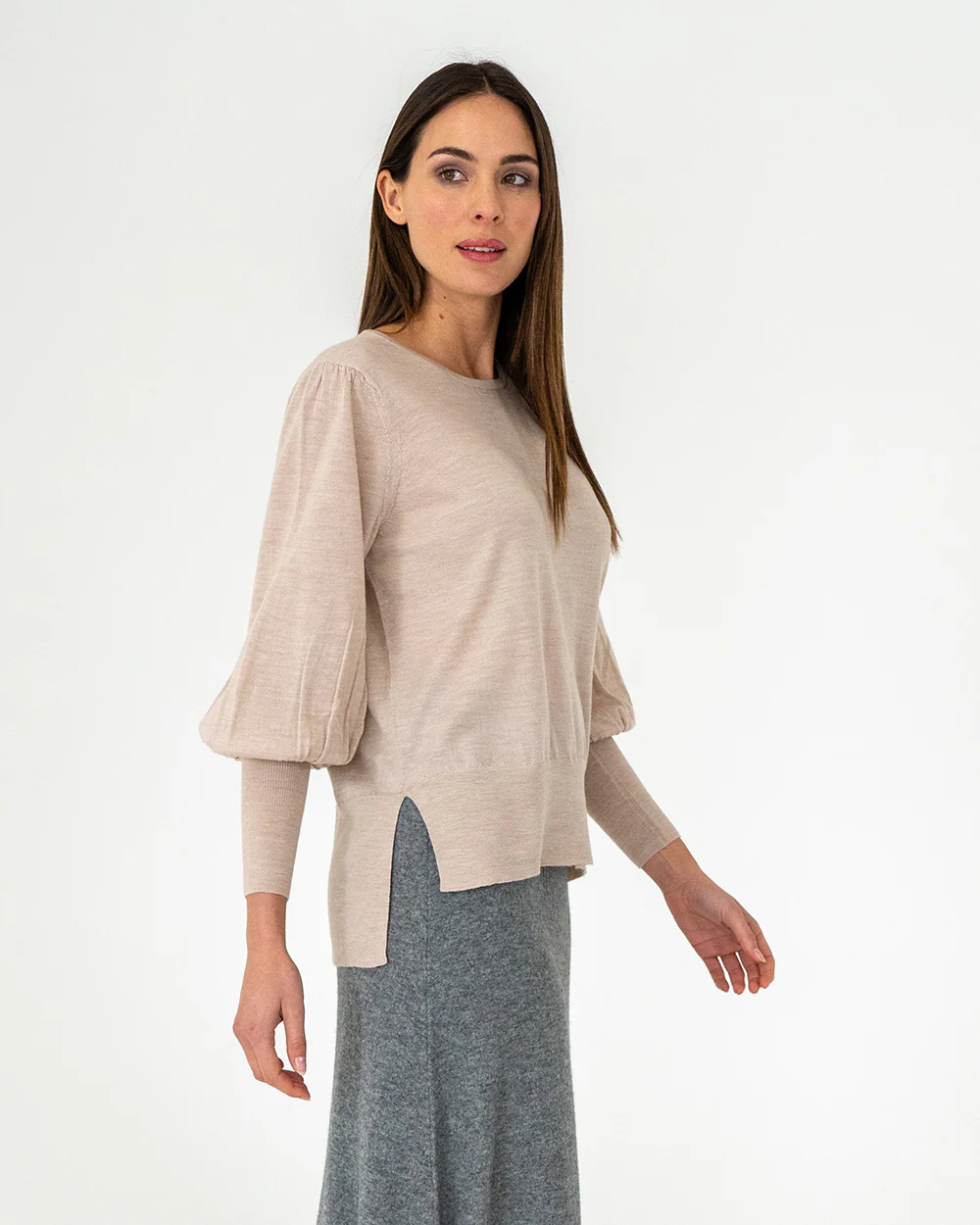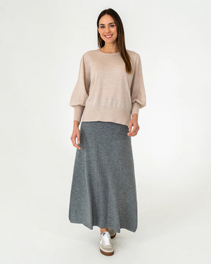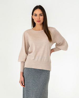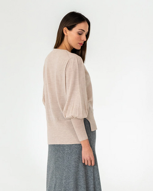 Crafted from 100% merino wool in a superfine and lightweight, 16 gauge knit, the Charley Knit in Winter White by Arlington Milne ensures a soft touch against the skin. It features a scoop neckline and includes a split hem that is a little longer at the back making it a perfect knit to wear out over a skirt or trousers or to tuck in. A feminine blouson sleeve with an extra wide cuff creates a dramatic look for any outfit.