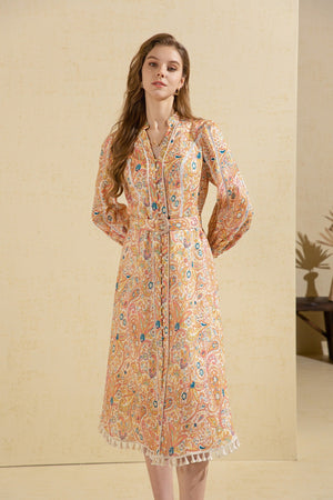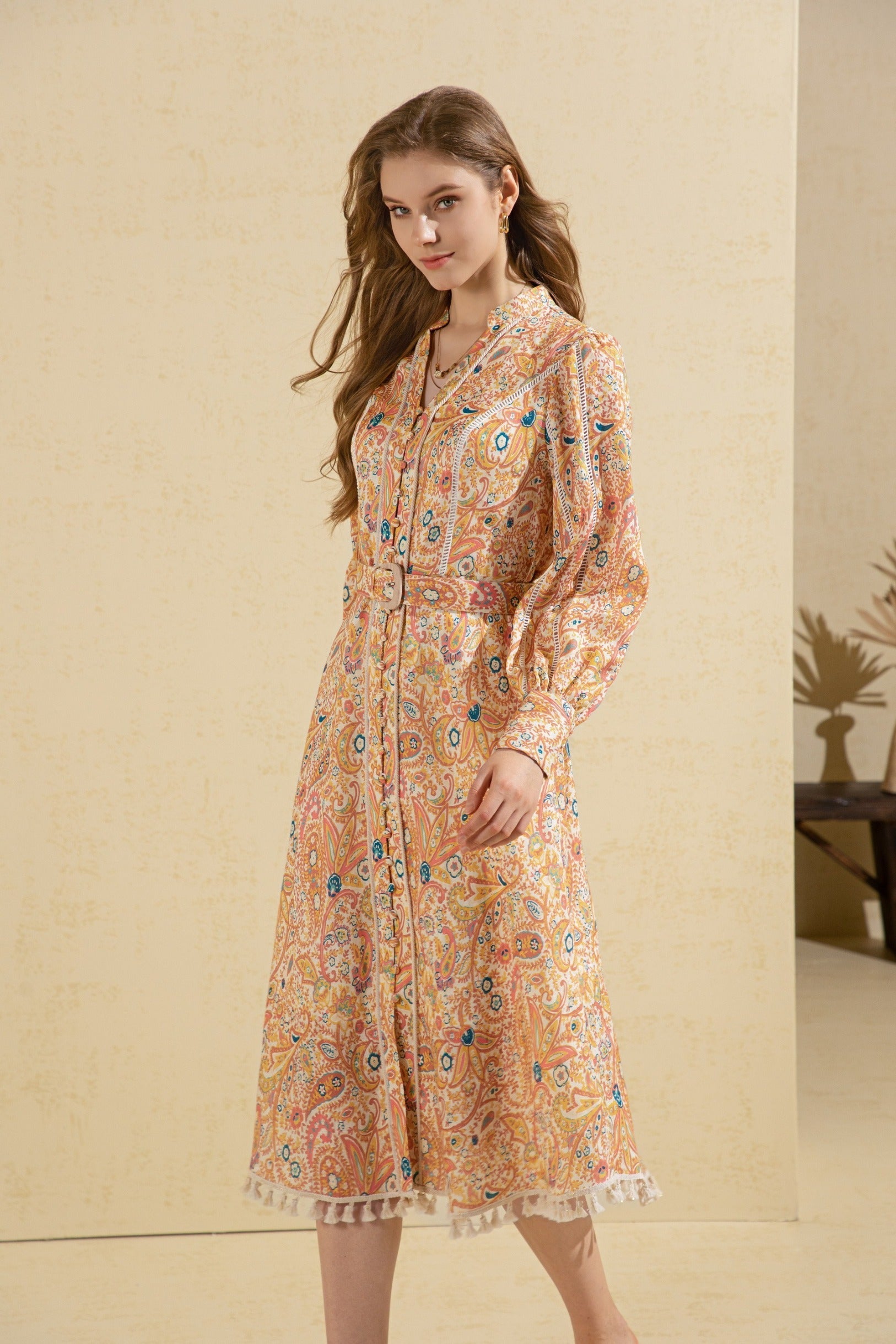 This charming linen printed dress blends natural elegance with intricate detail, featuring a delicate V-neckline and a belted waist that beautifully defines the silhouette. Adding a romantic touch, the dress incorporates hollow lace accents that create a jointed effect with the printed fabric. These lace details bring a subtle sheerness and intricate texture to the design, enhancing the dress's feminine and vintage-inspired charm. The lace placement accentuates key areas, such as around the neckline, sleeves, or hem, harmonizing beautifully with the linen print for a balanced and refined look. - Lined