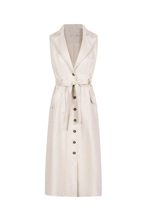 Matte with a slightly crisp, structured drape, characteristic of linen. Intricate oversized hand-stitched detailing outlines the collar in a light contrasting thread, giving it a handcrafted, artisanal edge. Samuel dress strikes a balance between structured polish and relaxed sophistication—ideal for those who appreciate clean lines with thoughtful details. - Lined
