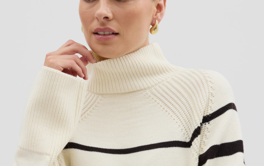 The High Neck Stripe Sweater by Iris & Wool in rye melange/chocolate is a timeless essential, crafted from soft Australian Merino wool with bold contrast stripes. Featuring a high ribbed neckline and relaxed fit, it balances cosy warmth with clean, contemporary structure.
