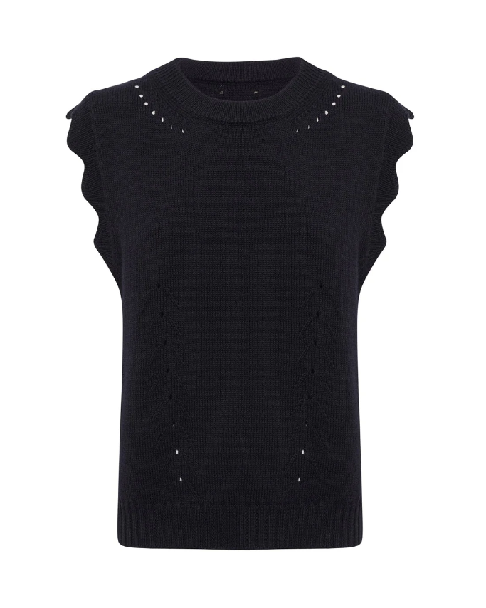 The Scallop Vest in black brings a touch of timeless elegance to any wardrobe. Thisladies knit vest is crafted from premium merino wool, featuring a flattering scalloped sleeve, crew neckline, and subtle stitching for a classic silhouette. Perfect as a versatile layering piece, this wool vest serves as a reliable wardrobe foundation that you’ll reach for season after season. Available in both black and Panna (cream), it’s an essential for those who value style and quality inmerino wool clothing.