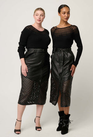 Refined, modern, and effortlessly chic, the Rhiannon Viscose Nylon Sheer Knit Top in Black is a statement essential designed to elevate your everyday wardrobe. Crafted from a soft viscose-nylon blend, this long sleeve knit offers a smooth, flattering fit with just the right amount of stretch.