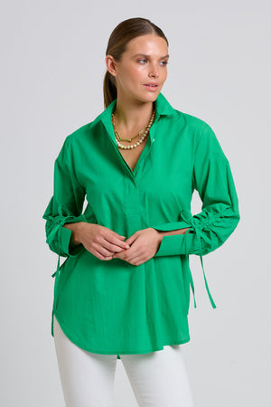 The Millie Girlfriend Shirt by Shirty is a stunning green that is sure to be worn on repeat. We love the adjustable sleeve detail.